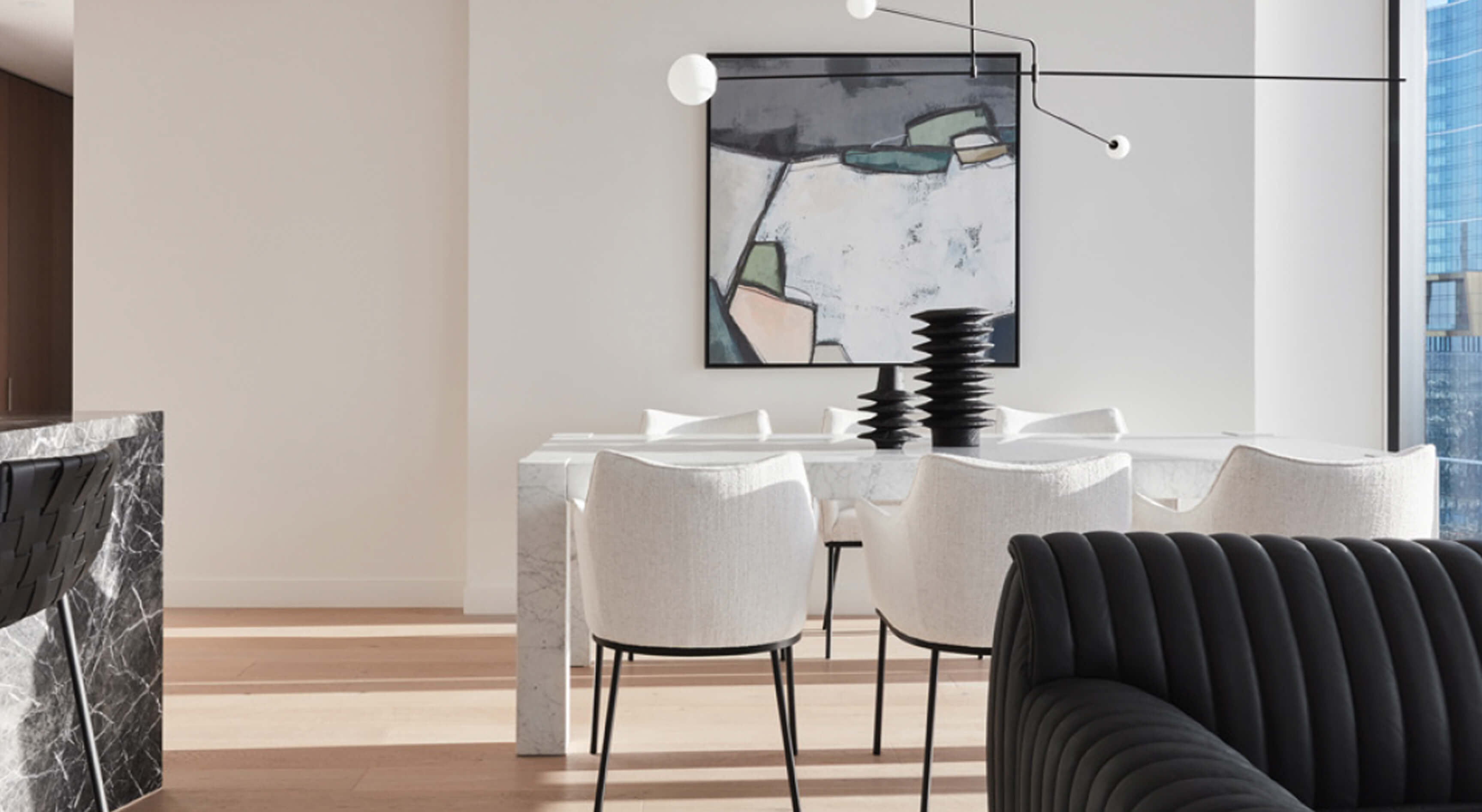 In the three bedroom residences, timber herringbone floorboards ground the living zones with warmth and texture, while bespoke pendant lighting over the kitchen and dining areas adds a sculptural, refined detail. Across all apartments, additional custom joinery further elevates both functionality and finish, reinforcing a sense of understated, resolved luxury throughout.