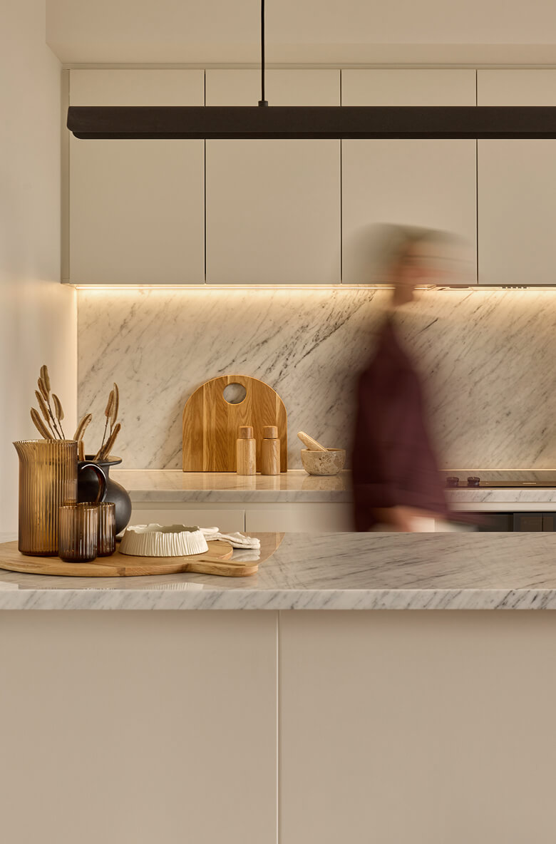 In the three bedroom residences, timber herringbone floorboards ground the living zones with warmth and texture, while bespoke pendant lighting over the kitchen and dining areas adds a sculptural, refined detail. Across all apartments, additional custom joinery further elevates both functionality and finish, reinforcing a sense of understated, resolved luxury throughout.